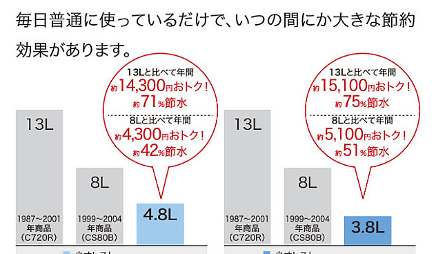 洗浄水量は「大4.8L/小3.4L(eco小)」と、従来製品に比べて大幅に節水可能。家計にも環境にも優しい設計です。