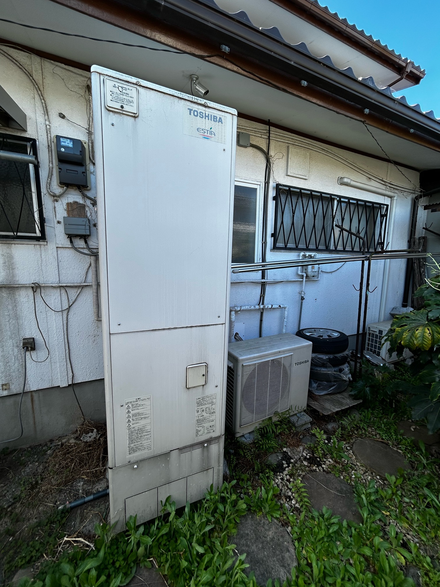 エコキュートは今までコンクリートの板を並べた不安定な場所に設置されていました。